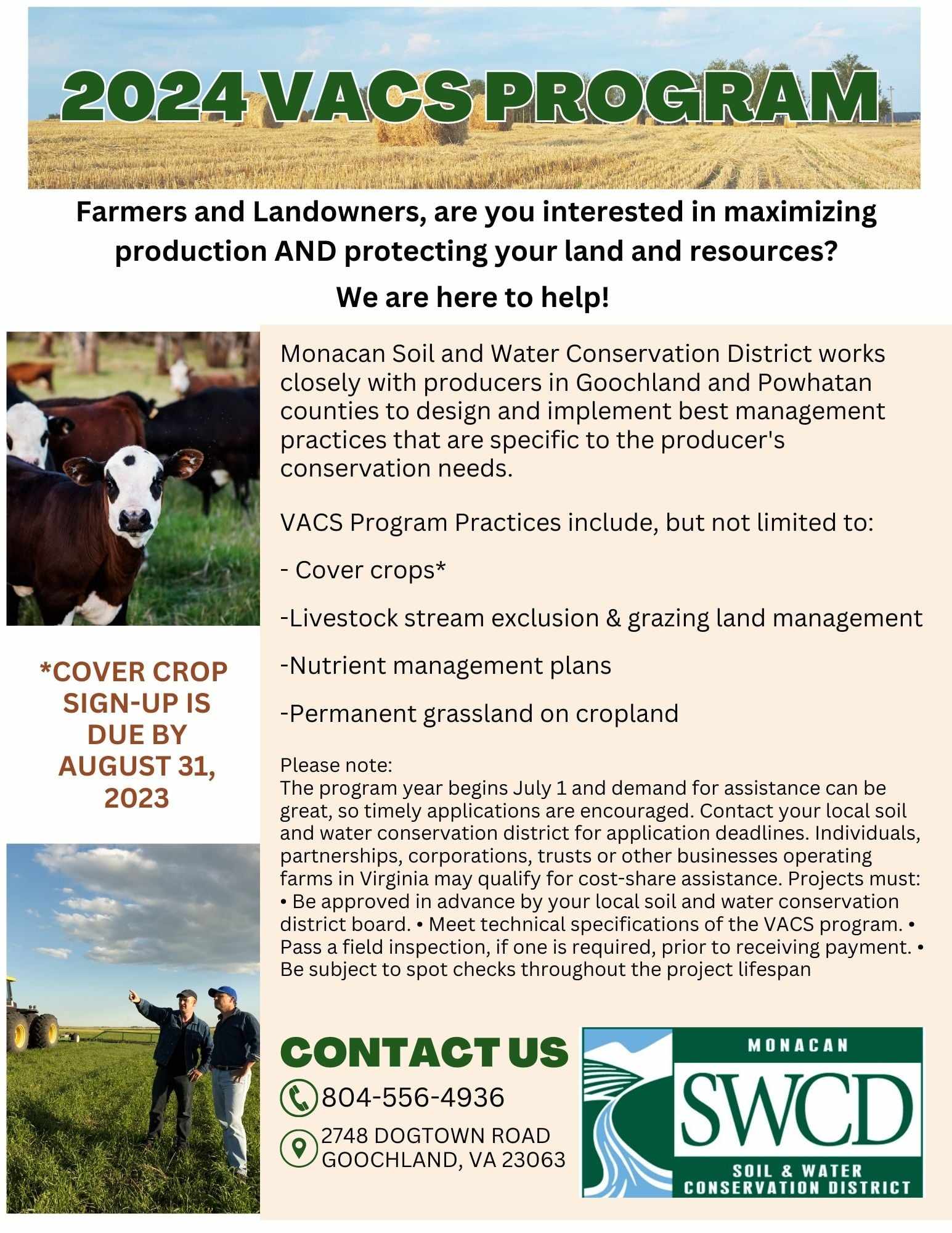 Monacan Soil and Water Conservation District (MSWCD) is accepting applications for the 2024 Virginia Agriculture Cost Share (VACS) Program.  They are here to help farmers and landowners who are interested in maximizing production and protecting their land resources.