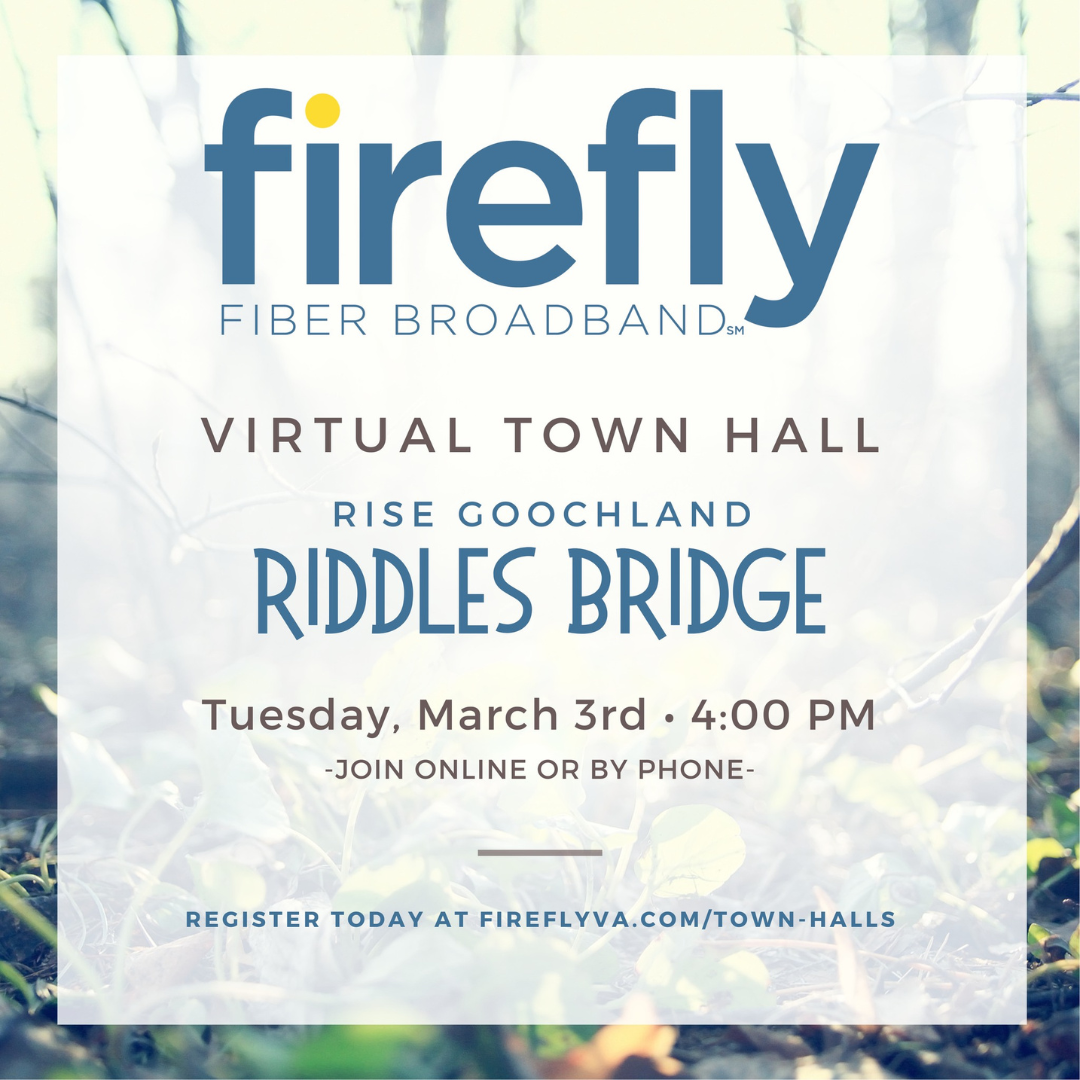 Firefly Fiber Broadband is holding a Virtual Town Hall on Tuesday, March 3rd at 4 PM for the RISE Project Riddles Bridge service zone to learn more about Firefly, ask questions, and find out how you can sign up for service. Firefly’s RISE Project Riddles Bridge service zone includes Goochland residents served by Dominion Energy who live in the Western area of Goochland as shown on the maps at https://www.fireflyva.com/dominion-energy-riddles-bridge/ .